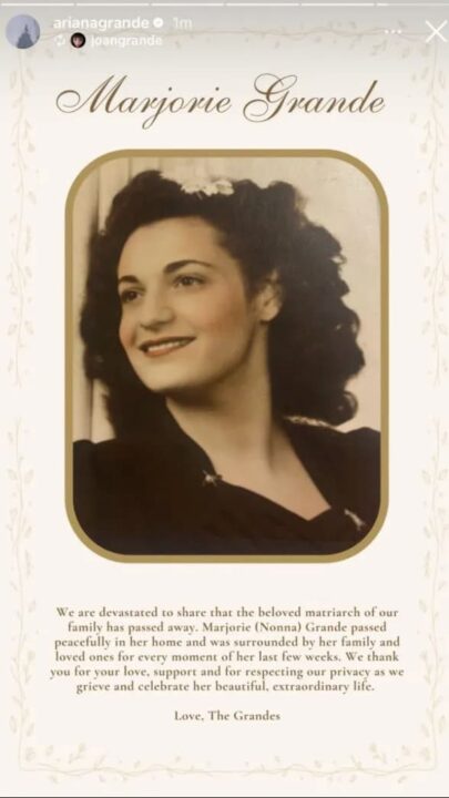 「マジョリー・“ノンナ”・グランデは自宅で穏やかに亡くなりました。ここ数週間は常に家族や愛する人々に囲まれていました。みなさんの愛、応援に感謝します。悲しみに暮れて、彼女の美しい規格外の人生を称えている間はプライバシーに御配慮いただければと思います」